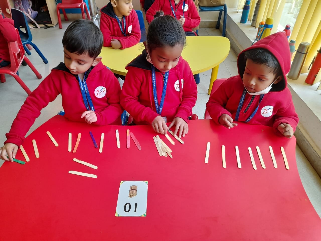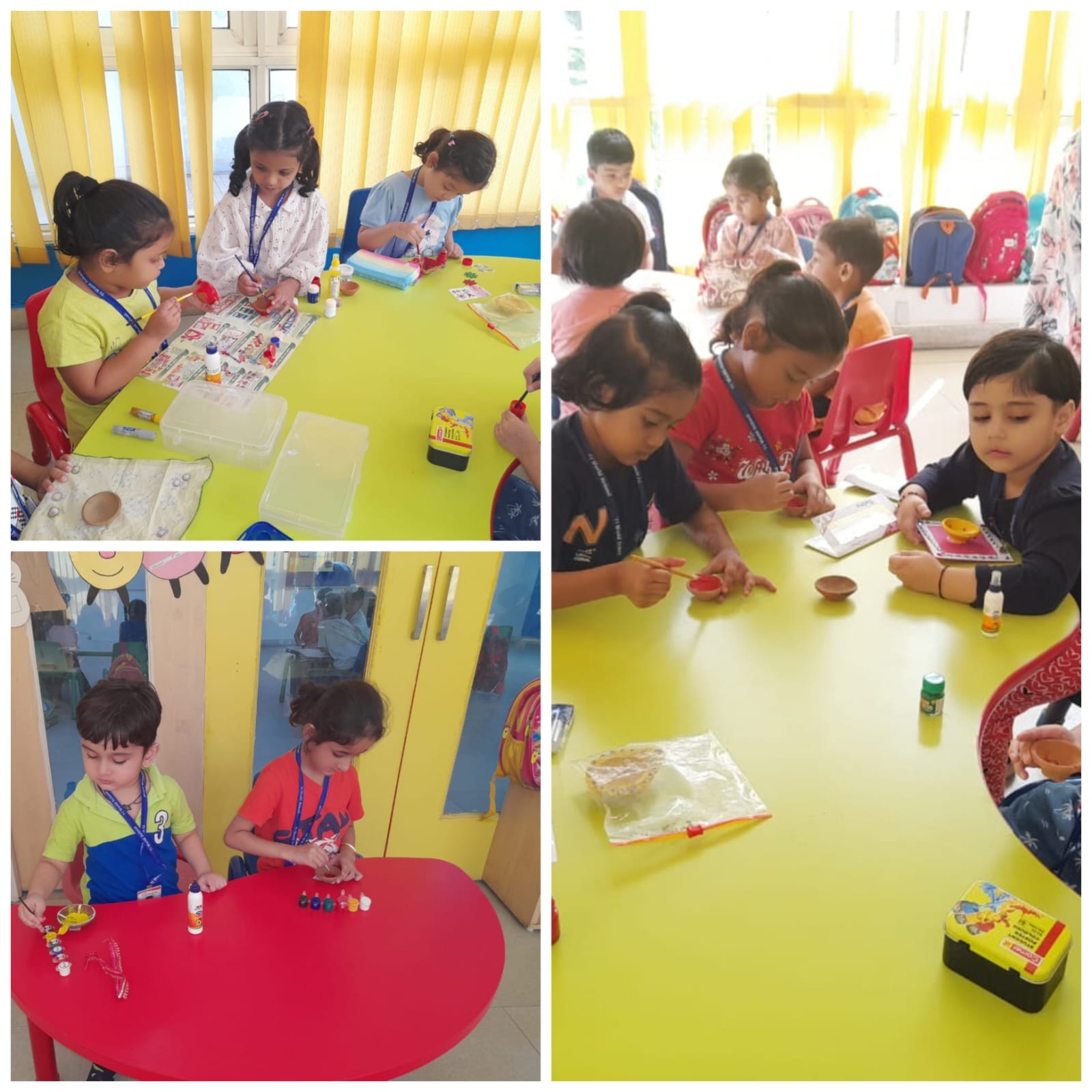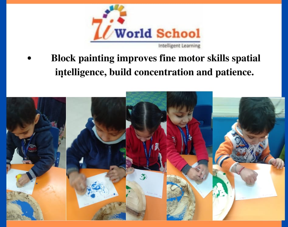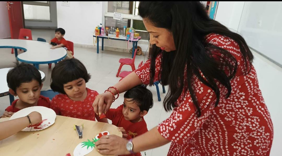 Students of Nursery learnt to paint by placing drops of paint on paper using a dropper .